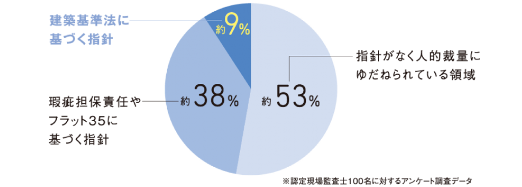家づくりをする上で、実は建築基準法で定められている法令はわずか9%程度にすぎず、職人や現場管理者の人的裁量にゆだねられている、指針の無い領域です。