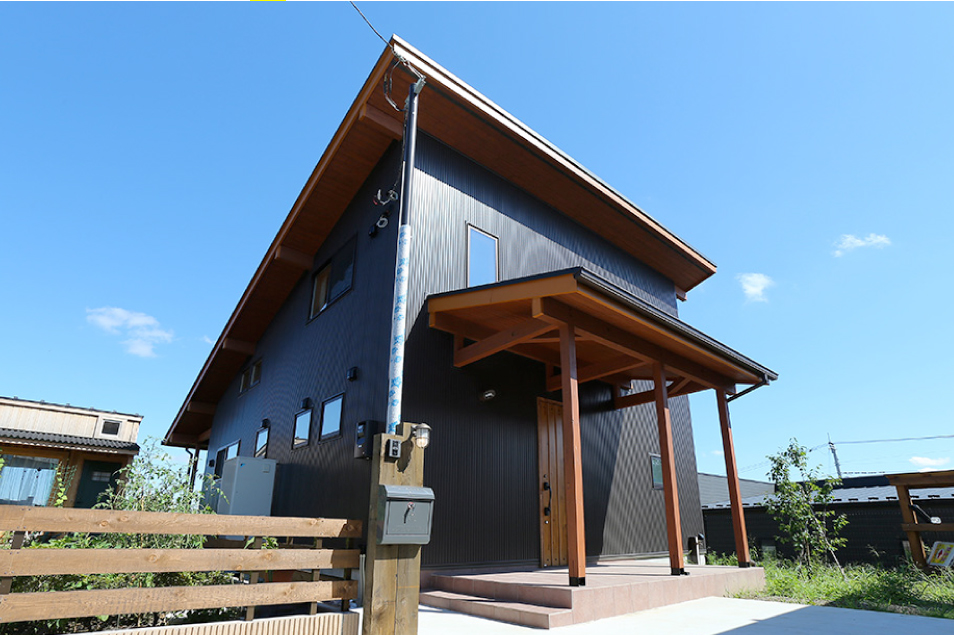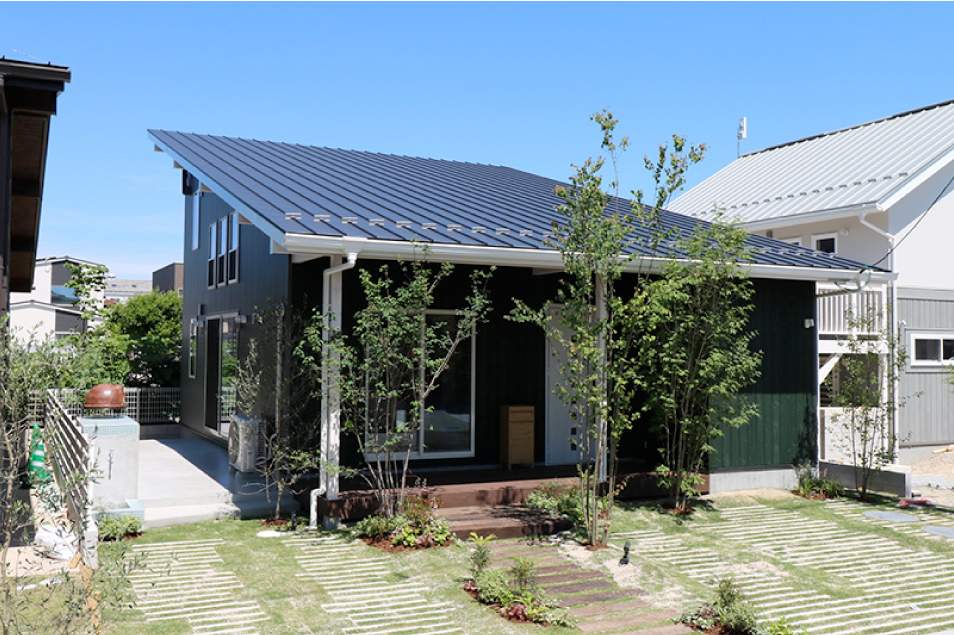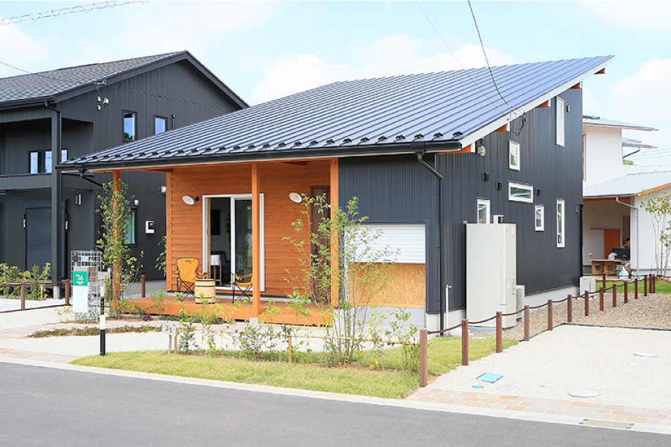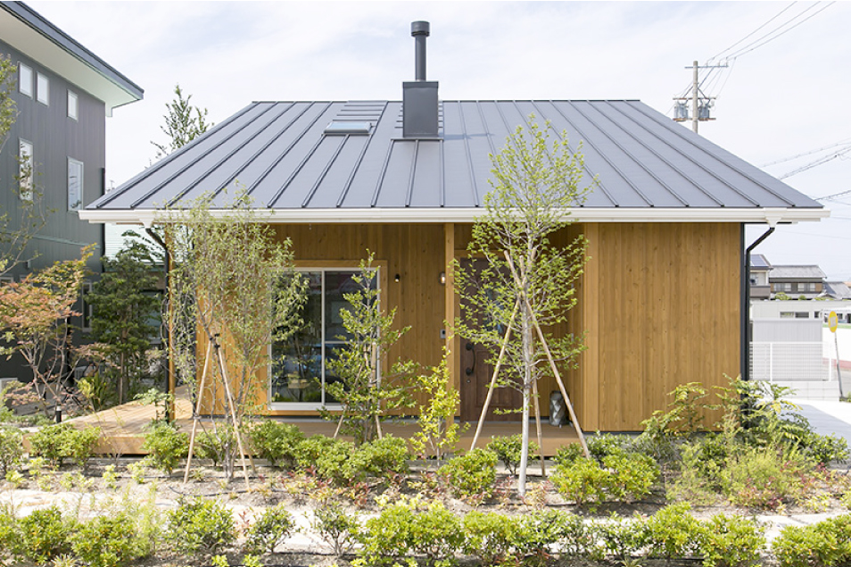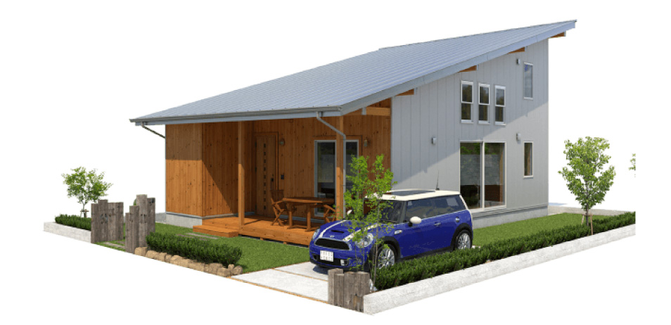 片流れ屋根のスタイリッシュな外観。広いウッドデッキでは、家族や仲間とBBQを楽しんだり自然の風を感じながら読書を楽しんだり。リゾート気分を味わえます。