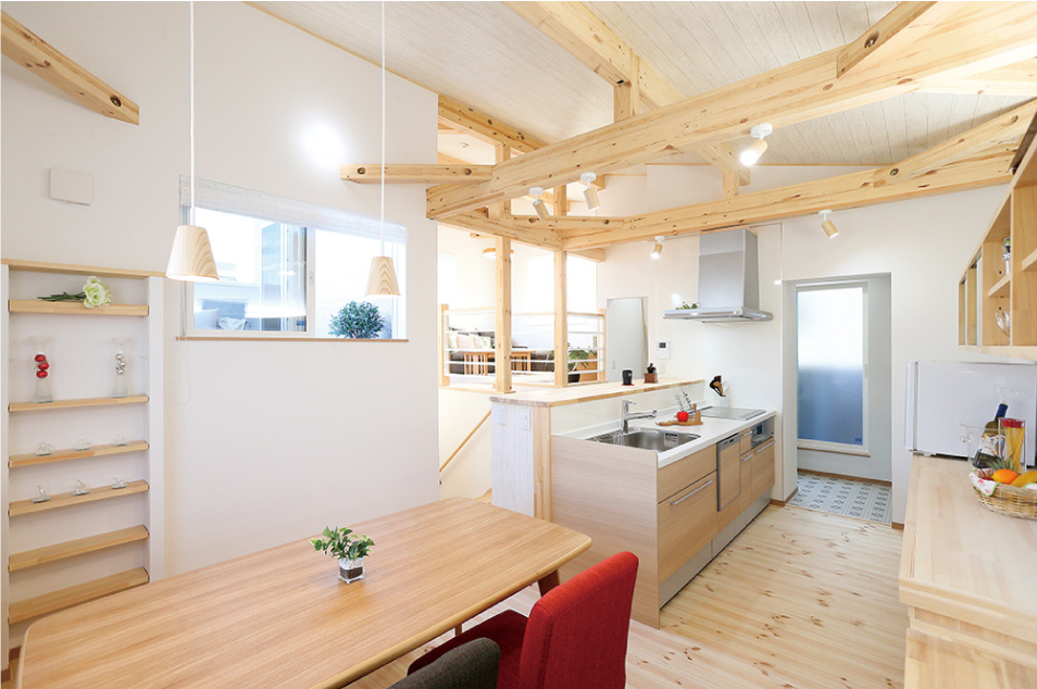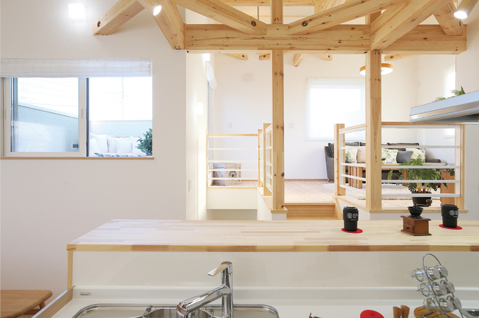 女性の声を生かして家事動線を考え抜いた設計。スカイバルコニーとフラットにつながる最上階のリビングは、広くて開放感たっぷり。2階のダイニングには、使いやすいと人気の高い横並び型キッチンを採用しました。いつでも家族の顔が見える設計です。