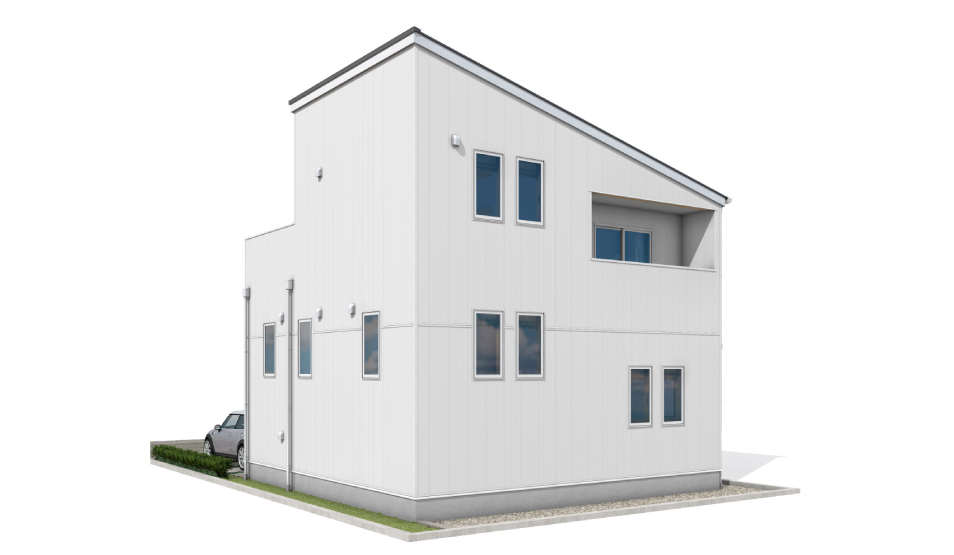 シャープなフォルムとリズミカルに配置された窓が、どこかキュートな雰囲気を醸し出すファサードです。シンプルな美しさと機能性を兼ね備えた穏やかで落ち着いたデザインは、街並みにも馴染みやすく住まう人の人柄をさりげなく表現します。