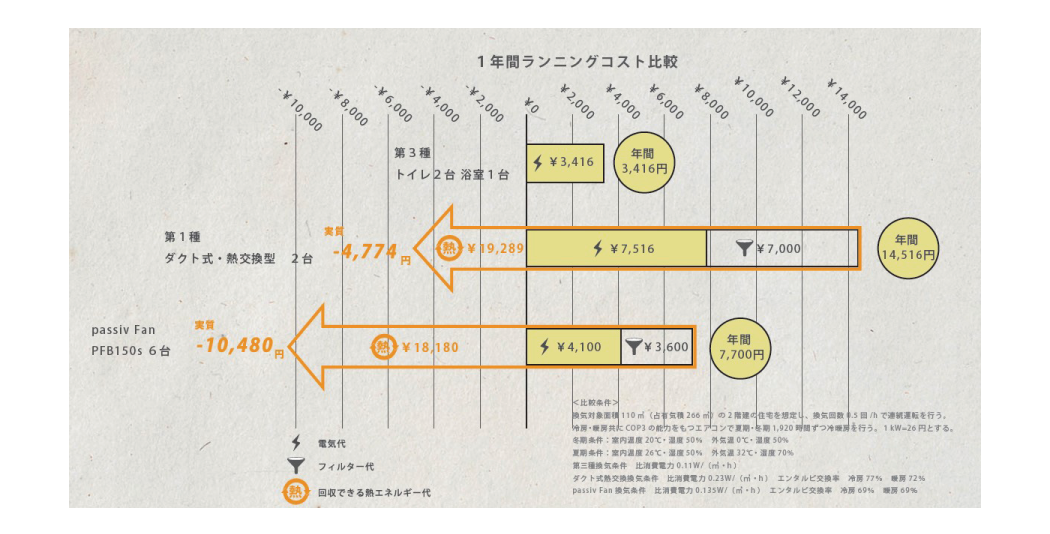電気代は従来の第1種換気の約半分。ランニングコストを最小限に抑えることができます。