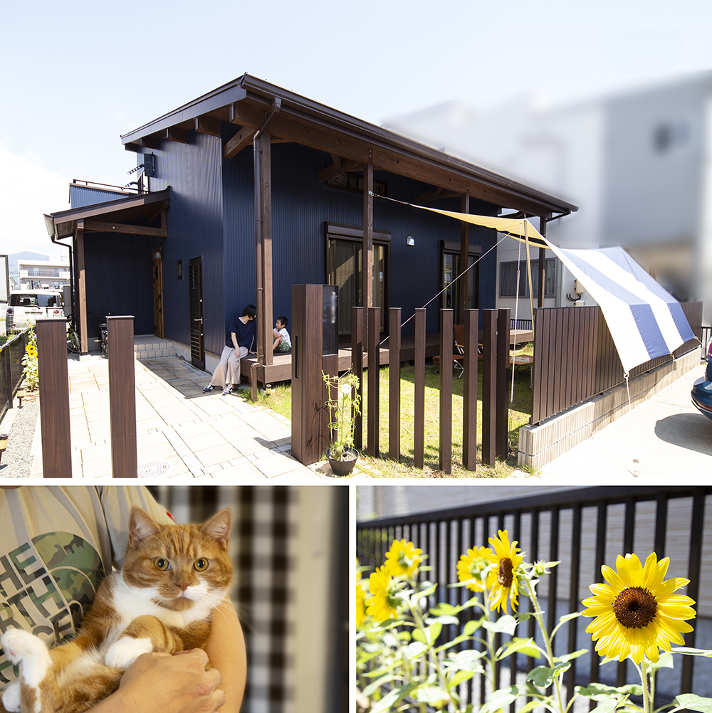 ▲ネイビーのガルバリウムとダークブラウンの無垢材の組み合わせが、スタイリッシュでかっこいい外観。取材日には、家を建ててから家族に仲間入りしたという愛猫のルークちゃんが♪