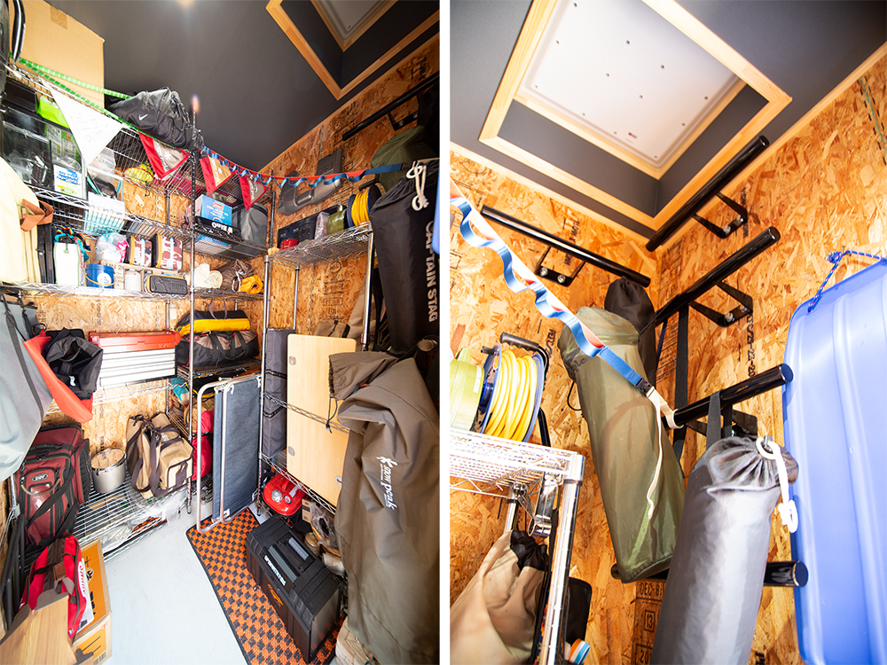 ご主人:キャンプ用品が多いのでアウトドアストッカーは重宝しています。もう少し大きくしても良かったかな?と思うくらい。寝袋関係はストッカーではなく小屋裏に収納したくて、ストッカーと小屋裏を通じるようにしてもらい、はしごをつけて上り下りできるようにしました。