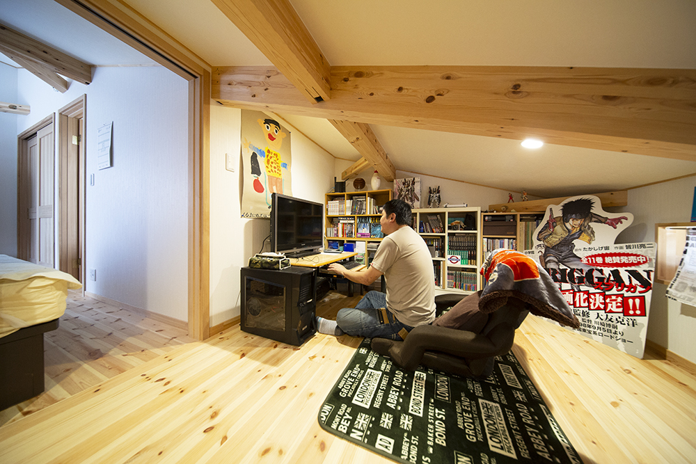 ご主人:小屋裏は半分収納、半分僕の趣味空間になっているんです。漫画読んだりパソコンしたり。1人の時間を満喫しています。このちょうど良い広さが落ち着きますね。
