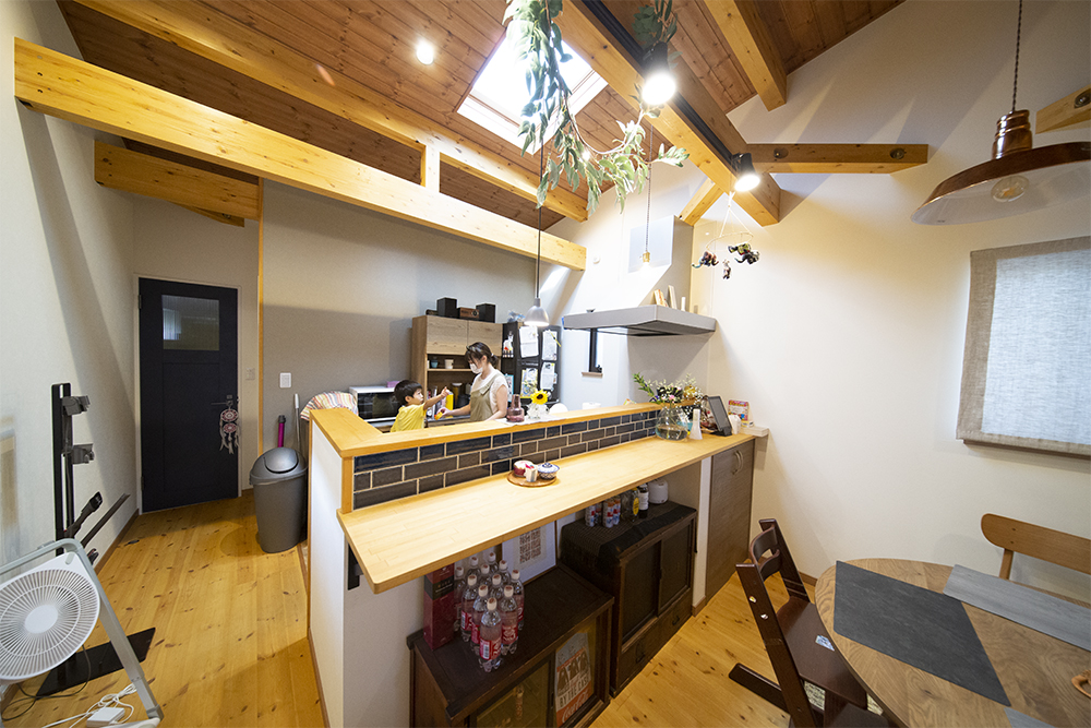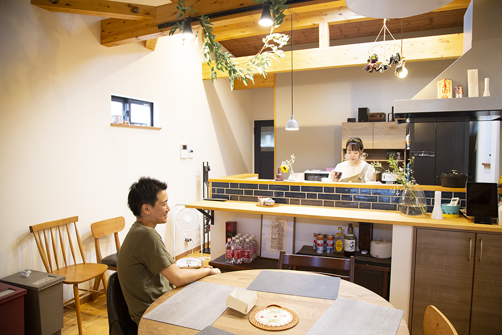 奥様:夜、ひと段落したときにダイニングに座ると、ここから見えるキッチンがかっこいいな、おしゃれだなって思うんです。「これでお酒飲めるね〜」なんて言ったりして(笑)。木の梁が出ている感じが雰囲気が良くて落ち着きます。アクセントに付けたタイルは最初、面積が少なかったかな?と思いましたが、いざ完成してみると良い感じになりました。背面のクロスもグレーにして良かったです。タイルもクロスも実際貼られたらどんな感じになるんだろう?ってドキドキしましたが、全体的にうまくまとまって満足しています。