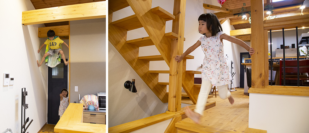 ▲取材時もお子様たちが元気よく走り回ったり、壁をよじ登ったり☆まるで家の中がアスレチックのよう!