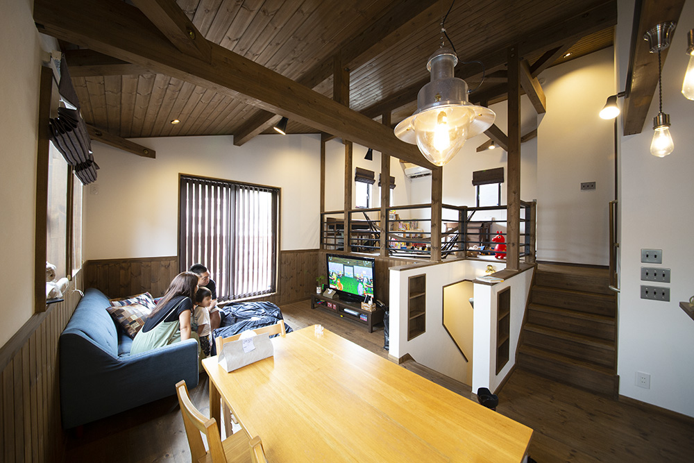 ▲展示場と同じように、天井のはめ板と腰壁を採用。ご夫婦ともナチュラルな雰囲気よりカッコいい感じが好みだと、塗装も展示場と同じトーンで統一した。