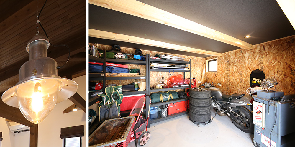▲ペンダントライトは届いた状態で不具合があったので、ご主人自ら直して設置したのだそう!アウトドアストッカーは壁も天井も展示場と同じ仕様。鳥坂展示場はまさしくご夫婦の理想の家だとか