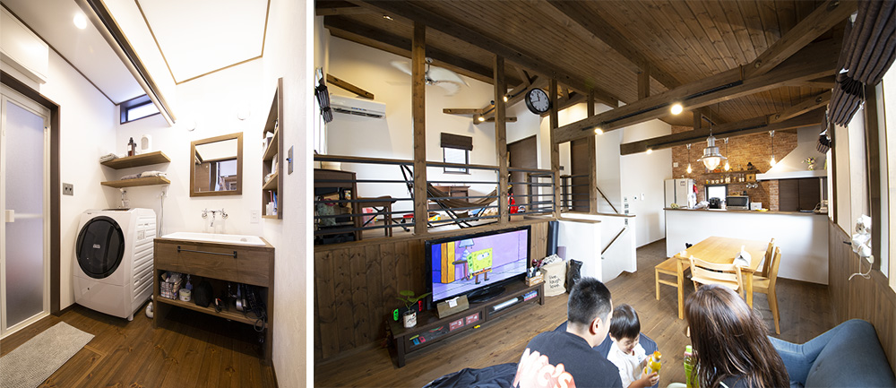 奥様:洗面は造作です。扉を開けているとリビングから見えるので、どうせならカッコよくしたいなと思って作ってもらいました。シンプルで使い勝手も良く気に入ってます。脱衣所と洗面を分けれるように、その部分だけ天井を低くしてロールカーテンを設置してもらいました。今はまだ子どもが小さいから使ってないけど、成長したら必要になると思って。