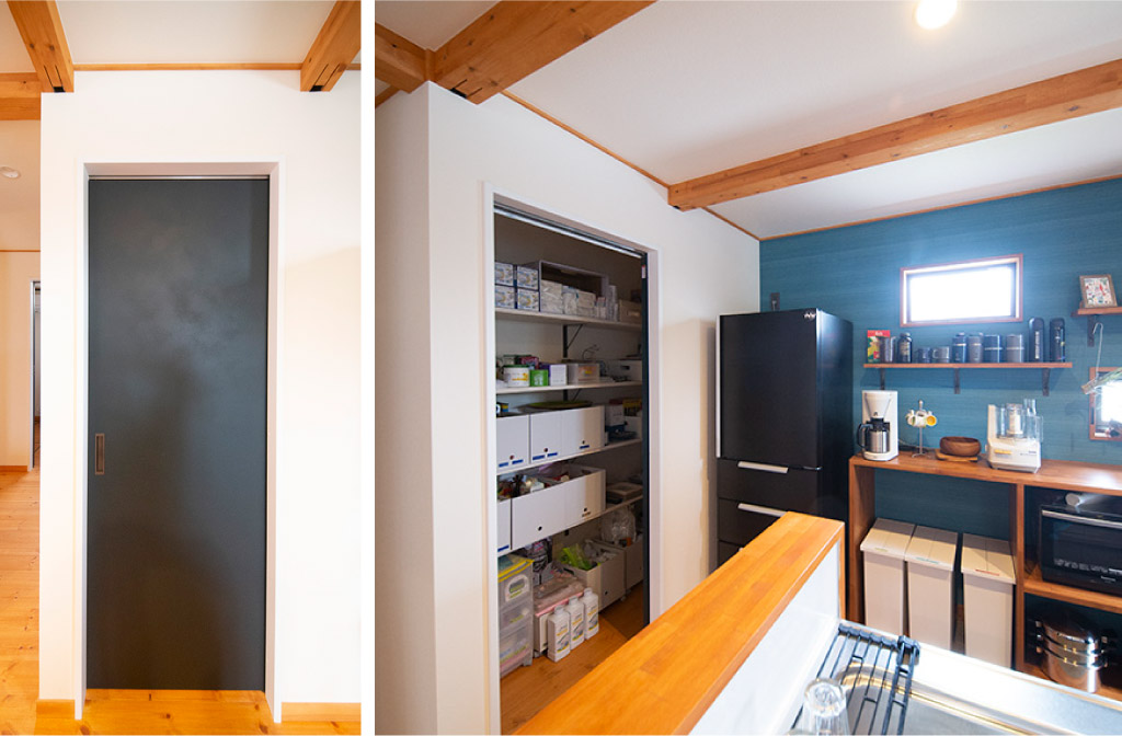 奥様:家の中が綺麗に保てて、趣味のスペースも堪能できているのは収納スペースがちゃんとあるからだと思います。パントリーは備蓄している食料や日用品、書類関係などの置き場兼隠せるスペースになっているので、あって良かったです。主婦の方には「ここ羨ましい〜!」って必ず言われます(笑)。買ってきたものを一旦置けるところは本当に必要でした。キッチンの中や後ろの棚だけでは収まらないし、細々したものを隠せるとキッチンが雑多な感じにならないんです。