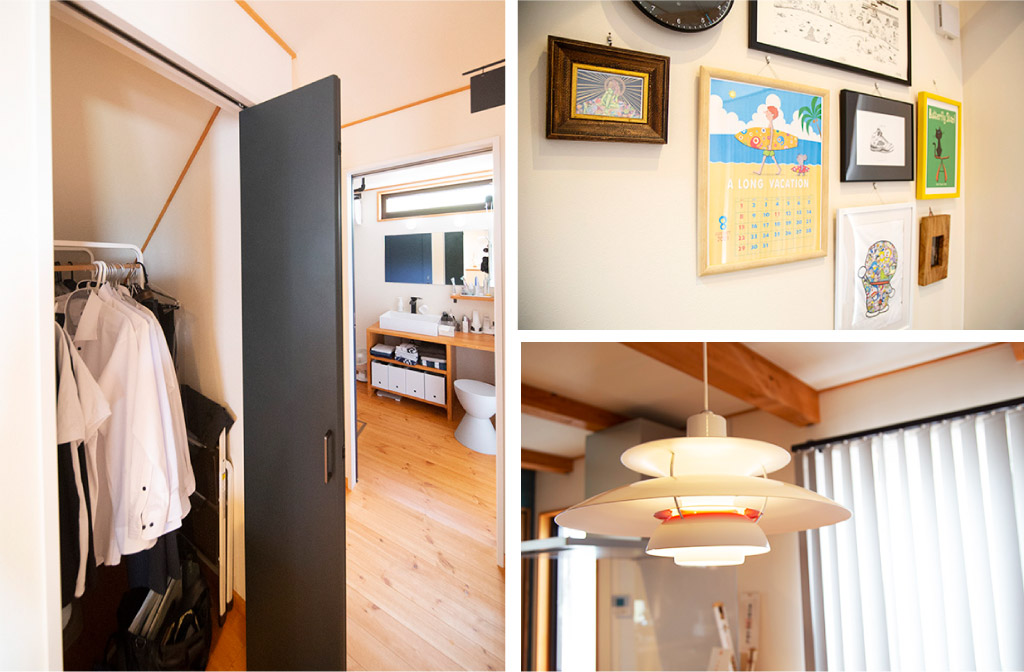 ご主人:ふたりとも服が多いので、目一杯とれるだけのウォークインクローゼットを作ってもらいました。アパートにいたときは服が溢れてましたからね(笑)。古いアパートだったんで、作り付けのクローゼットがなくて収納グッズを買い足して買い足して何とか収めてた…いや、寝室が侵食されてましたね(笑)。なので、ウォークインクローゼットは必須だったんですよ。その分、寝室は狭くしました。寝室は寝るだけのスペースだから必要最低限の広さがあれば良いので。ウォークインクローゼットを広くした方が僕たちのライフスタイルに合ってました。溢れかえってた服が今はうまく収まってスッキリしてます!