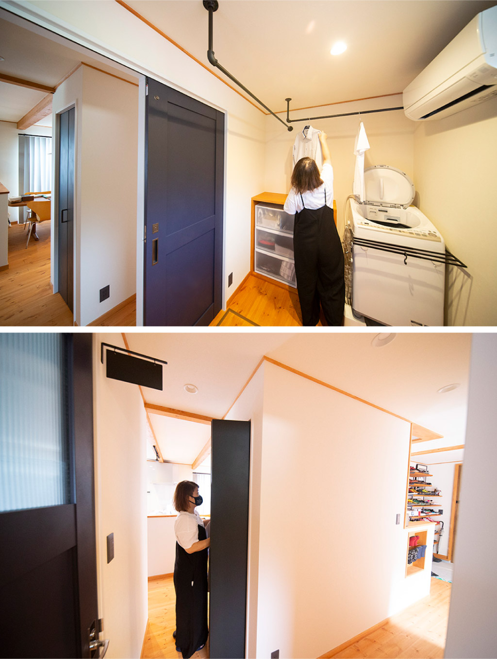 ▲“洗濯機から洗濯物を出す→干す→仕事着はすぐそこのビジクロに仕舞う”の一連の動作が楽々♪