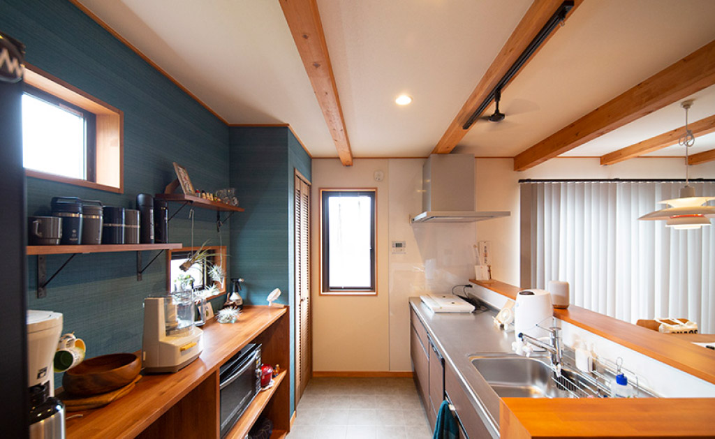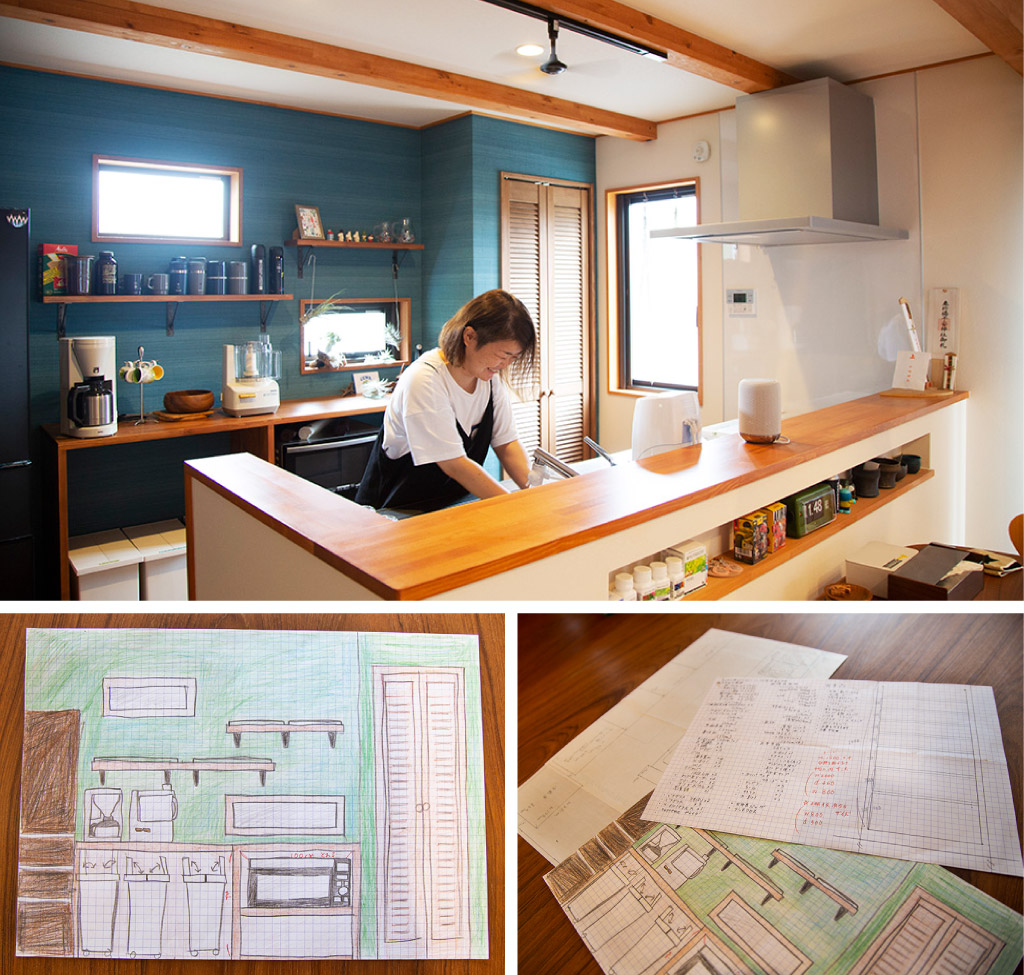 奥様:家づくりに関してはふたりして相当こだわりましたね。こだわりの塊みたいだったかも(笑)。“こうしたい!”ってことに対して一切妥協してないです。こだわるところは分担みたいな感じだったんですが、私は毎日立つところなのでとにかくキッチンに全力を注ぎました。まず造作棚はどんなものがほしいかを考えるのに、置くものを全てリストアップ&採寸して絵と設計図を描きました。背面のアクセントクロスは“こんな色がいいな”という色を塗ってイメージしたんですが、壁紙のカタログに理想的なものがあって!まさしく絵の通りになってます。