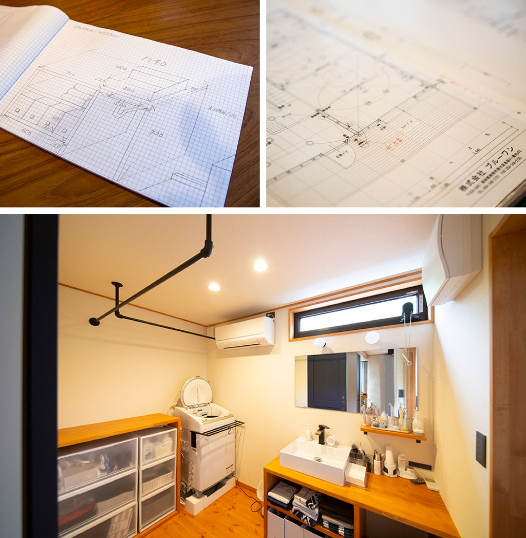 ▲左上:ご主人が描いた造作洗面台の設計図。ここから変更し、今の配置に。ご夫婦とも本当に細かいところまで考えていて感心します