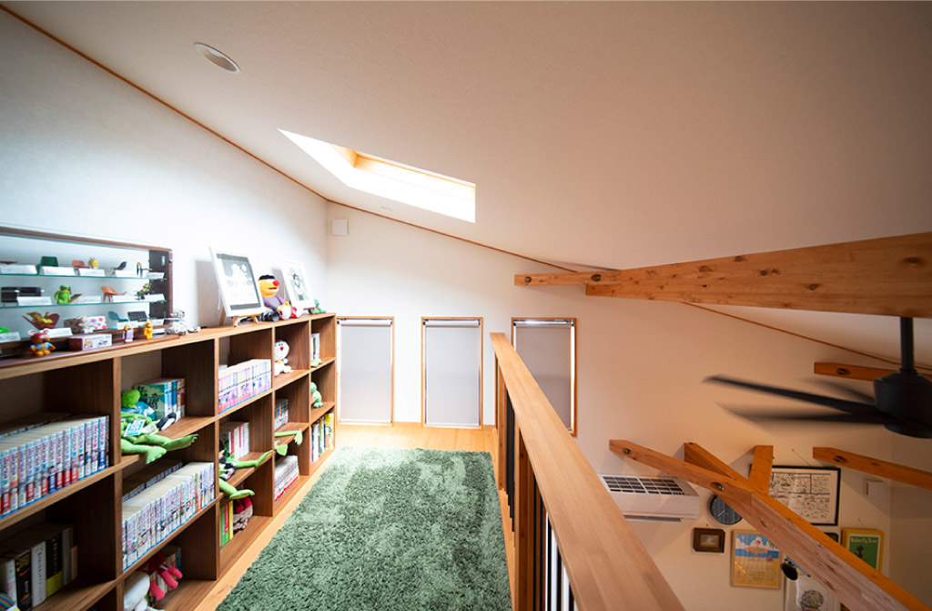 奥様:ロフトのところに天窓を付けたんですけど、それが最高すぎました!カーテンを開けると、日中は日差しが入って明るいですし、夜は月や星が見えるんです。それを見ながらボーッとする時間が最高に幸せですよ。ここは寛げるフリースペースにしてるので、好きな漫画読んでゴロゴロしたりしてます。