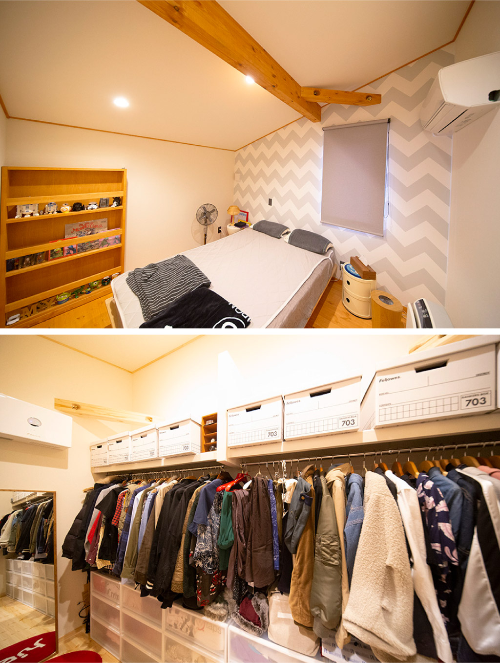 ▲上:主寝室。入って右側がウォークインクローゼットに繋がる。左側にあるラックをスライドすると小屋裏の収納部屋が。小屋裏は普段使わない用品を入れる収納庫に。