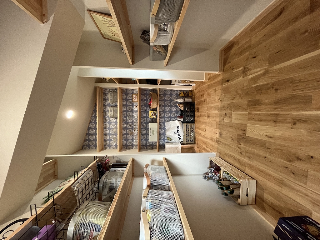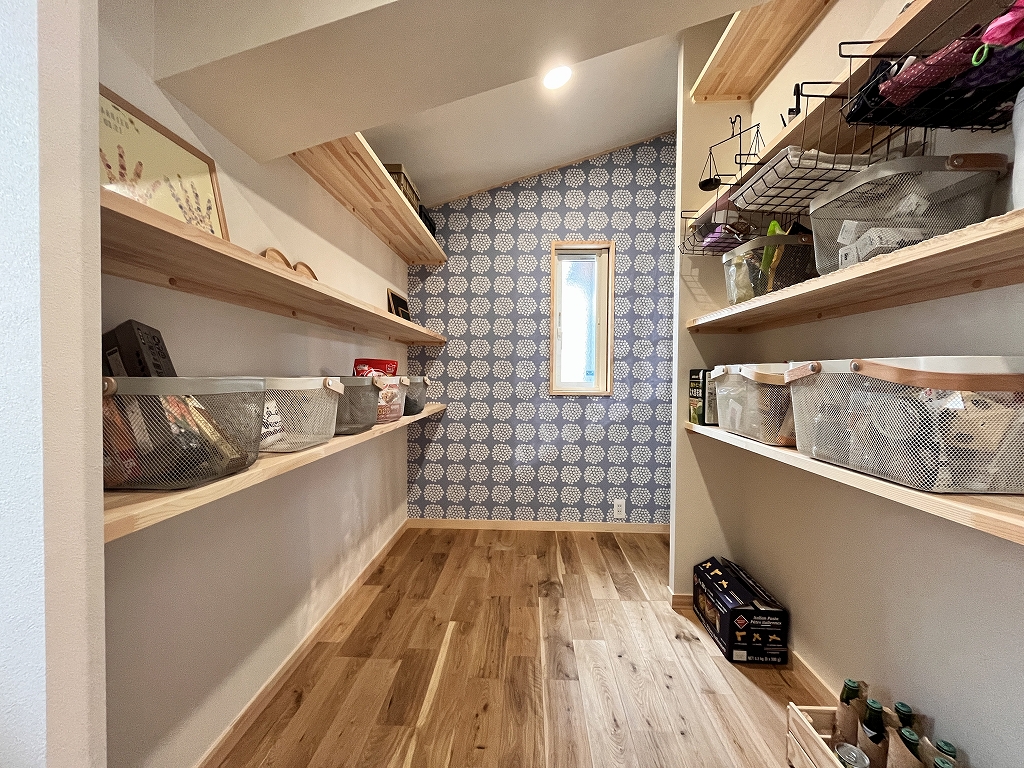A.:モデルハウスで見てから真似したいと思った無垢材や天井の板張り、アウトドアな雰囲気に加えて、ウォークインクローゼットやパントリーの増設、ランドリールームを広くすることで収納や実用性も兼ね備えた間取りにすることができました。